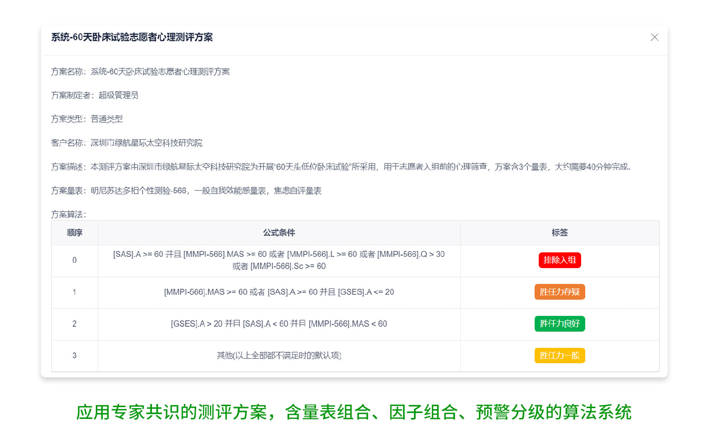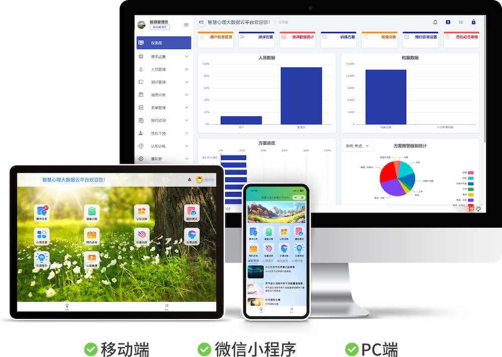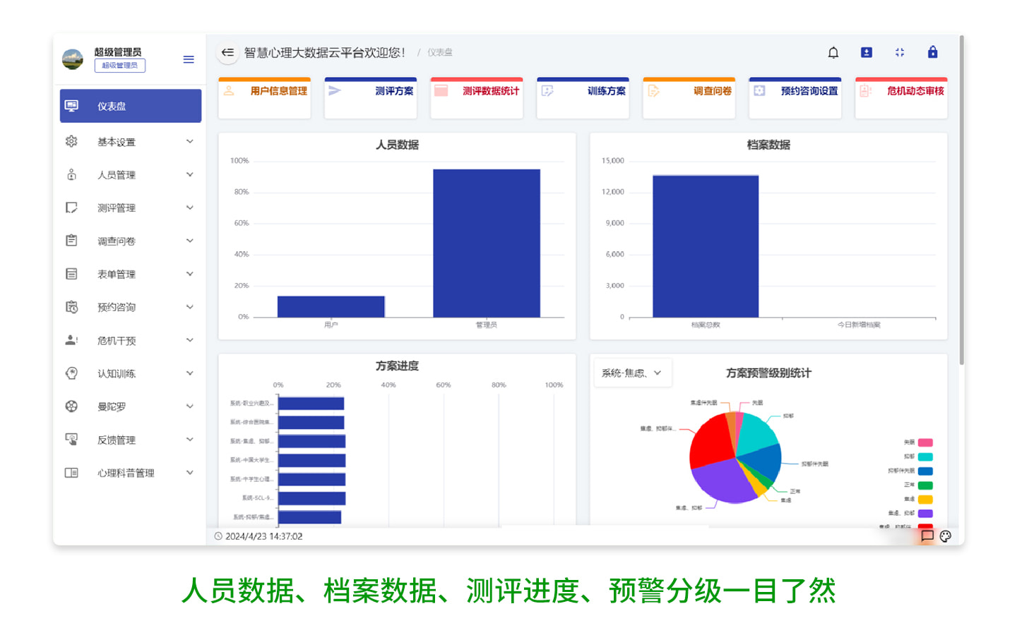系统精选心理健康常用评估量表工具15大类,辅助调查问卷系统,常模自动更新,实现心理行为问题筛查、心理危机即时预警、心理测评档案和全员心理健康水平综合分析报告一键生成,科学高效管理社会全员心理健康。