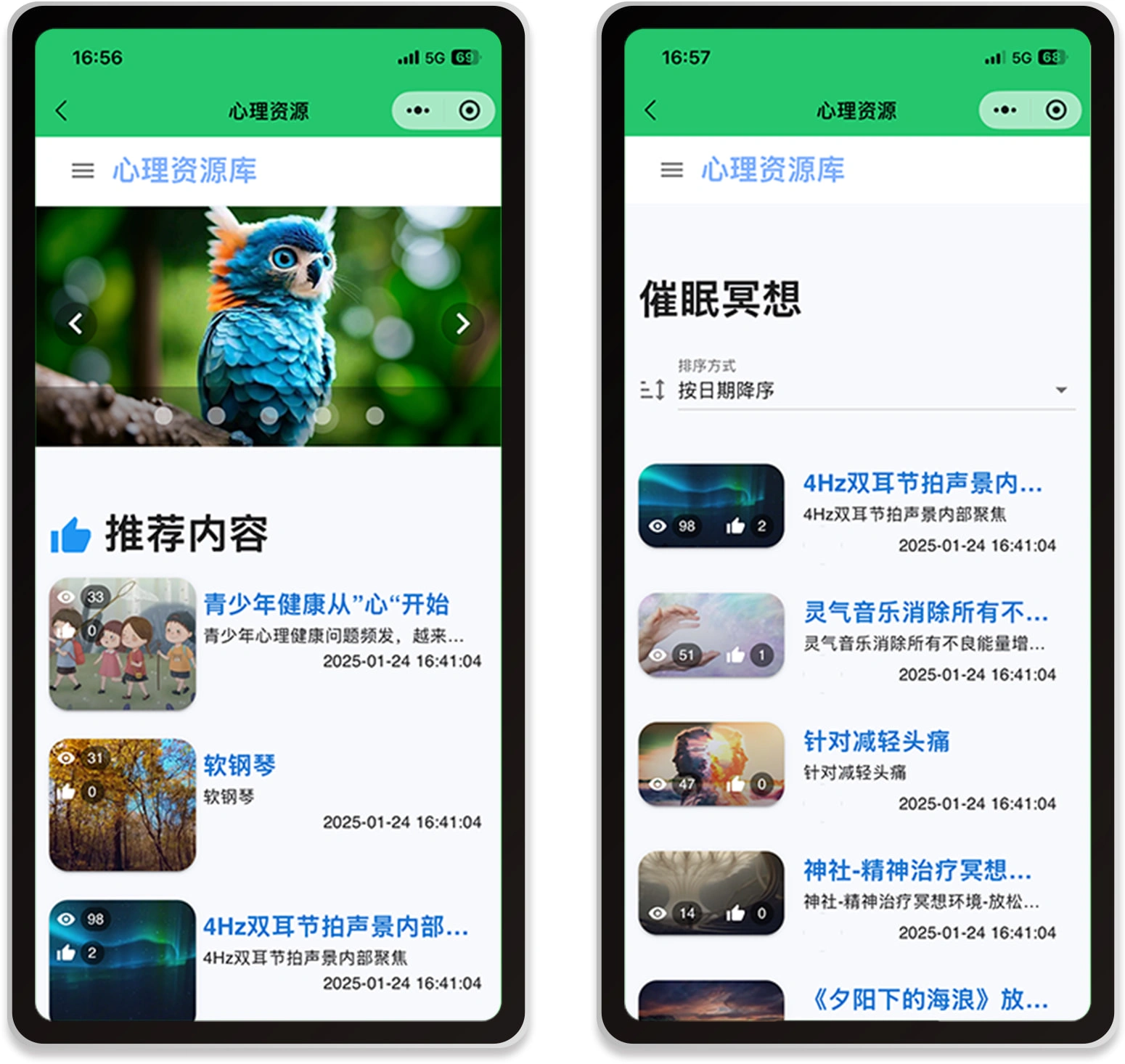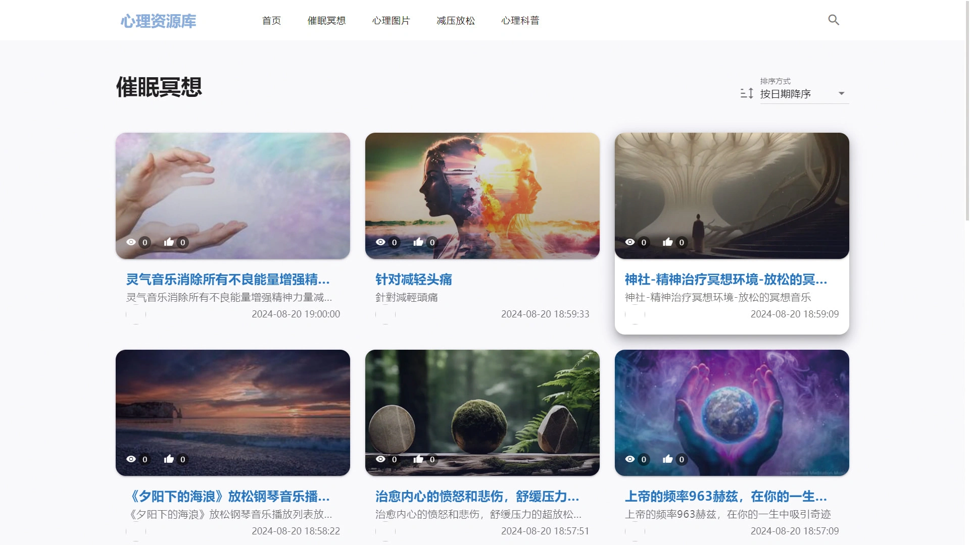 各种影音、图文等心理资源的管理平台,实现心理科普资源、心理课件资源、心理图片资源、减压放松资源、冥想催眠资源、心理微课资源等主流心理服务的内容管理、平台搭建、平台预览、资源转发共享等功能。